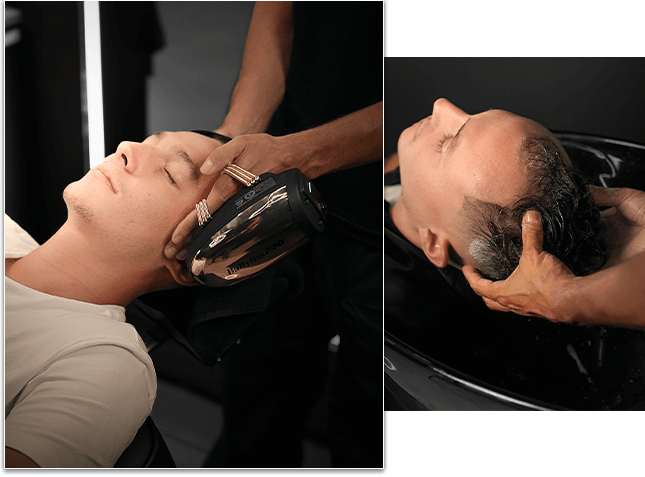 Accès exclusif à notre lounge, café ou boisson au choix, massage crânien, soin du visage et lavage avant et après la coupe, le tout accompagné d’un divertissement pensé pour ton confort.